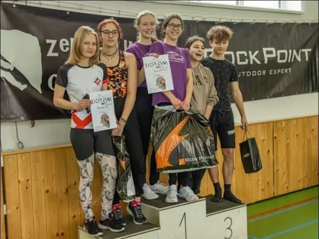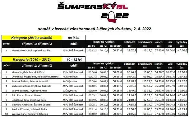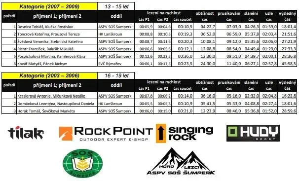 Tak tohle se povedlo, organizátorům i našim zástupcům. Lezecké závody s disciplínama z Mladých horalů, bez zdravovědy, orientace a stavění stanu. Tři soutěžní dvojice, tři kategorie a tři druhá místa. Ryze dívčí reprezentace složená ze "starých" matadorek i "skoro" nováčků se v Šumperku předvedla v dobrém světle a prožila příjemnou sobotu. Snad jen Týna se mohla vyspat doma a ne při jištění !!!