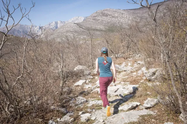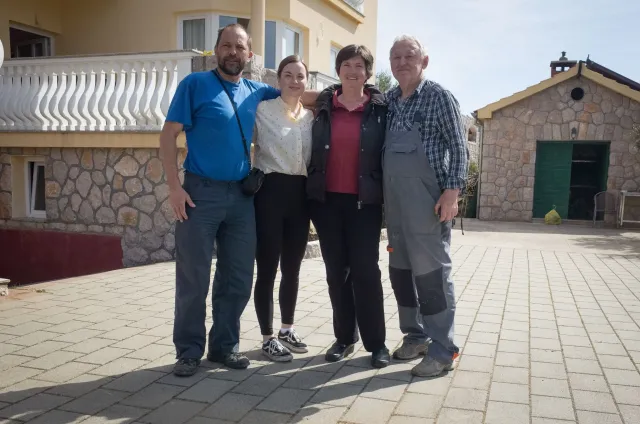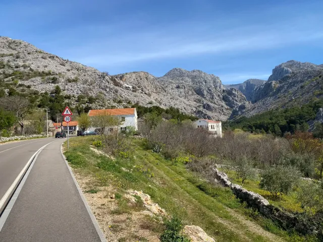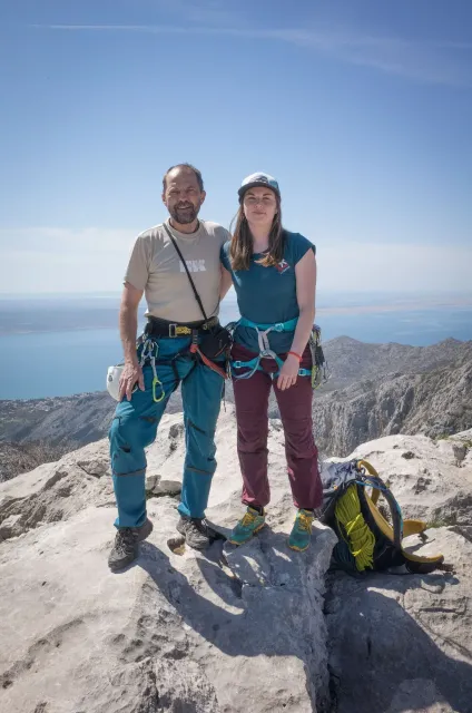 Hopkáme po vápencových břitech ostrých jako žiletky a neztáčíme to zpět pod stěnu ale jdeme hlouběji do hor. Nikdy jsme tam nebyli. Po hodině dvou nás ale zmáhá vedro a i čas. Ztáčíme to dolů do údolí k vodě, která nás osvěží a pak zpět pod Anicu a k autu. Během sestupu končí mnohaletá služba mých lezeckých kalhot. Pravá nohavice o hrot skály, levá pak o větev keře změnili nevratně svůj vzhled. Materiál je již tak vetchý, že operace jehlou nepřipadá v úvahu, vypadá to na definitivní rozlučku. Po návratu jsem ozkoušel moře. Ledovka, ale osvěžující, a dali jsme jógu, co ráno odpadla. Zdenka pro nás připravila luxusní večeři. Vývar a rybu se salátem a prostřela nám u sebe na balkóně. Povečeřela s námi i se svým dospělým synem Josipem, který nám poradil, kde se zítra zastavit na cestě na sever. Dobře jsme se pobavili.