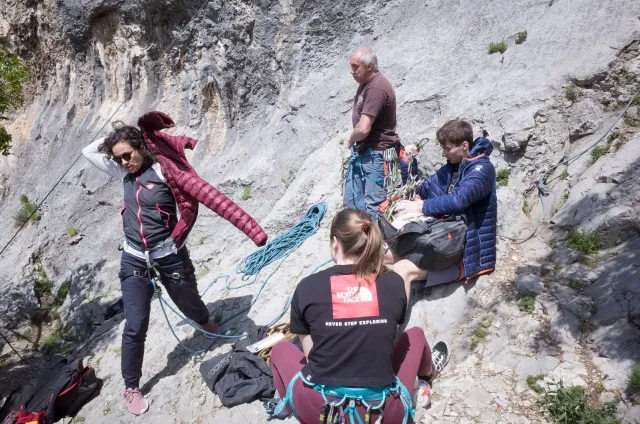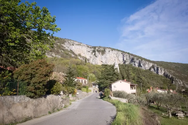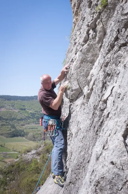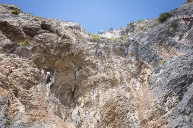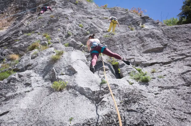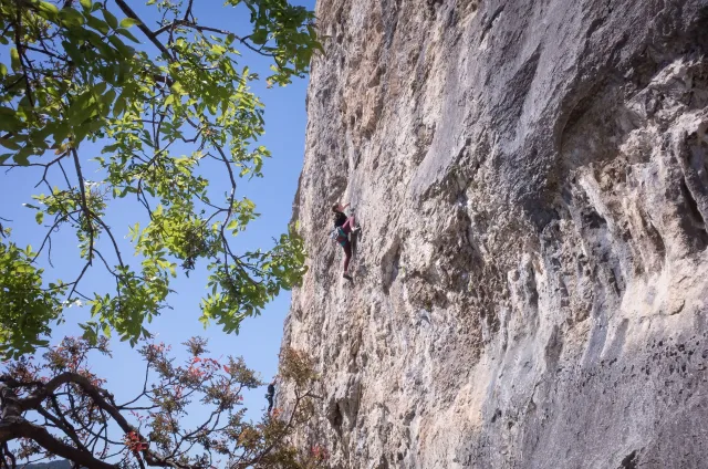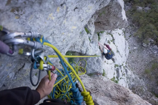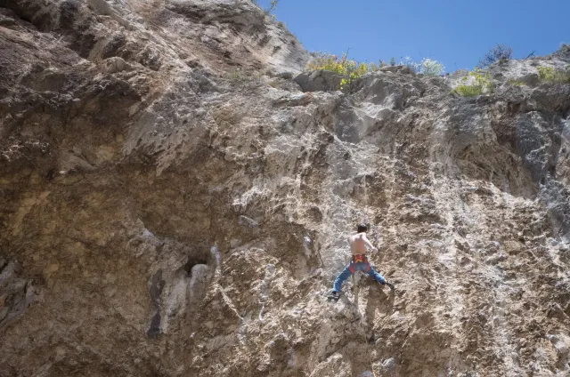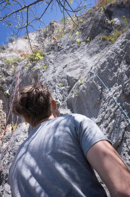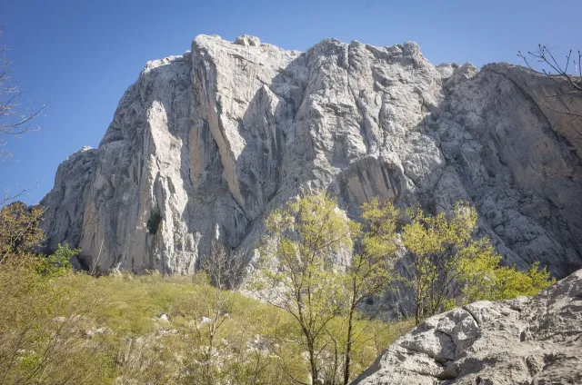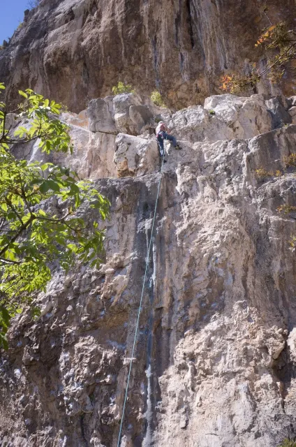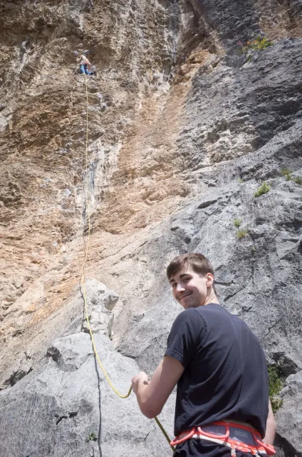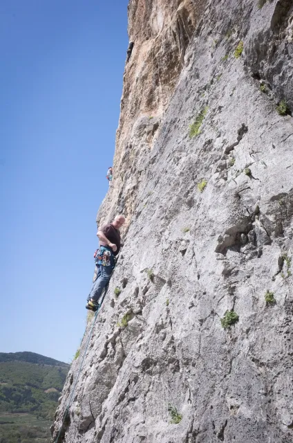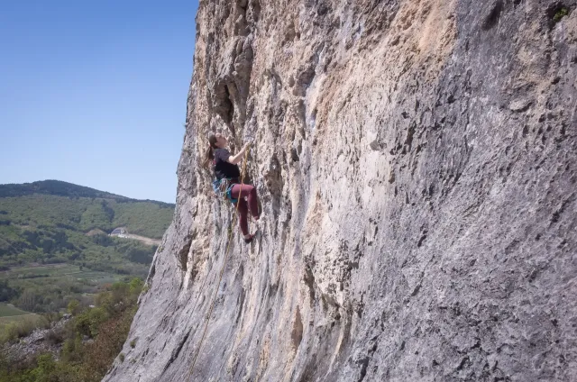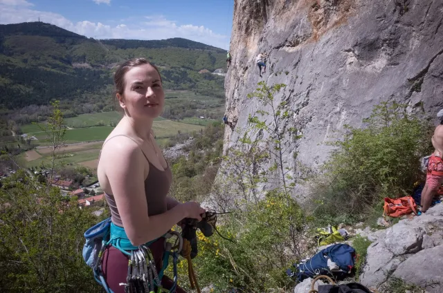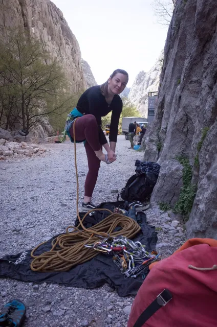 Lezení v Ospu je o něčem dost jiném oproti Paklenici. Klasa je tu tvrdší, skála ostřejší, cesty delší. Místo mých měkkých bačkůrek nazouvám Miury a rázem roste jistota v nohou a lezu o stupeň líp. Celé dva dny si vystačíme v sektoru Babna a vyhledáváme to lehčí, co tu mají. Až ke konci si Aňka troufá na sedmu a vysílením sedá před topem. Zkouším to po ní na druhém a končím ještě níž s hekáním, že se krávy v údolí plaší.
