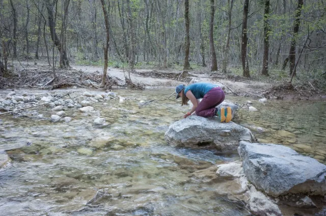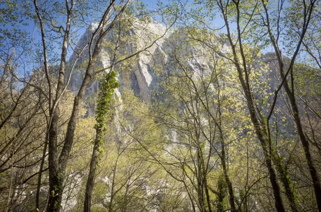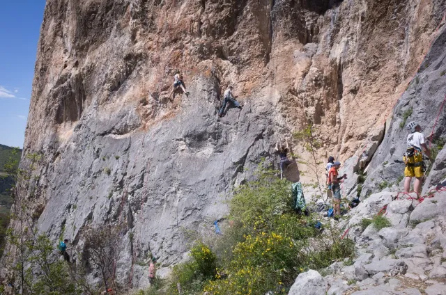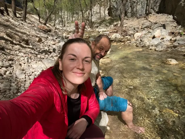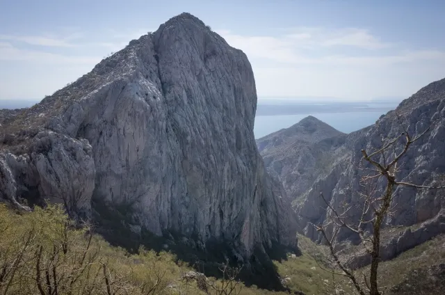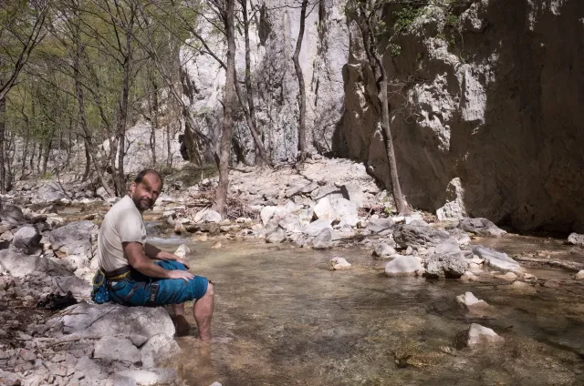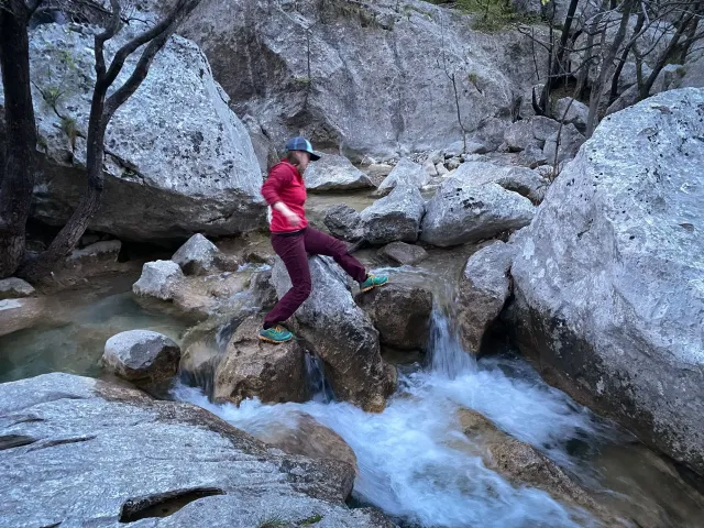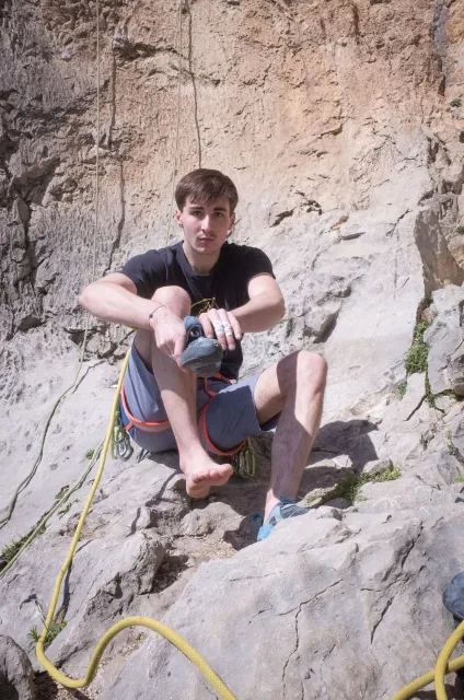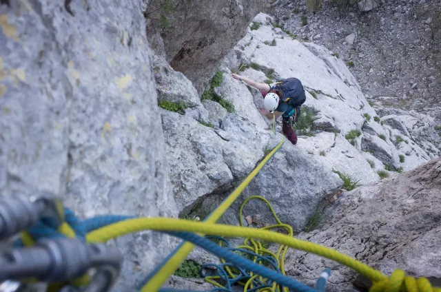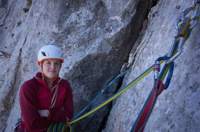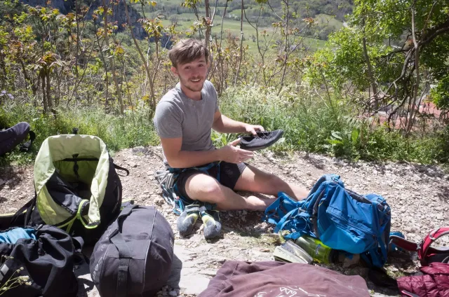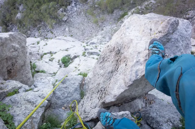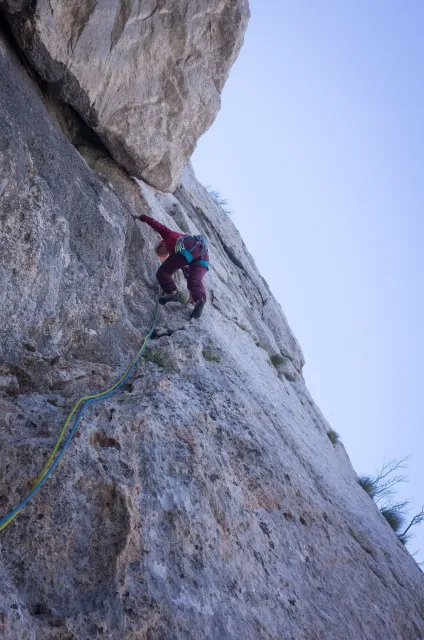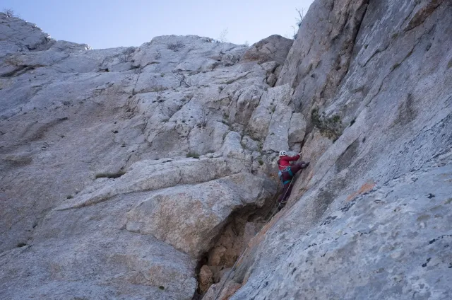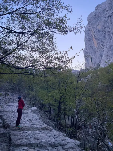 Vstáváme v pět a beze slova mizíme do tmy. Strážci na vstupu ještě nejsou, takže dnešní vstup do parku máme zdarma a po zaparkování stoupáme chladným ránem po vápencovém chodníku. Začíná se rozednívat a výše v údolí se již zjevuje zatím ještě temná stěna. Musíme ještě přehopkat vodu po kamenech a zvládnout strmé stoupání abychom nalezli náš nástup. Poznat se dá lehce podle obrovské zavěšené karabiny. Soukáme se do sedáků a kontrolujeme výstroj, zatímco nás z křoví pozorují místní kozy. Posílám první Aničku, chci, aby na ní nahoře vyšla klíčová délka a vychutnala si ji, na prvním ji ještě nelezla. Ještě před nalezením vedle nás nastupují také dva mladíci, jeden Fin, druhý britský Chorvat se našli na internetu a plánují vylézt Klin. Přejeme jim hodně štěstí, jejich cesta by na nás byla moc.