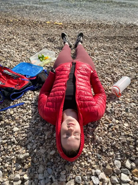 Na pobřeží se vydáváme na opačnou stranu, než k našemu apartmánu a hledáme příhodné místo k pikniku. Jedno takové se zjeví. Když k němu jdeme, v trávě před Aničkou opět přejede nějaký had. „Já budu dnes jíst asi ve stoje a na záchod už nikam nejdu“, prohlásí. U šplouchajícího moře jsme sami, jen se zbytkem toastů. Sedla si. I lehla a myslím, že i zklimbla.