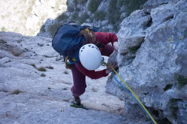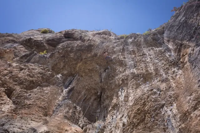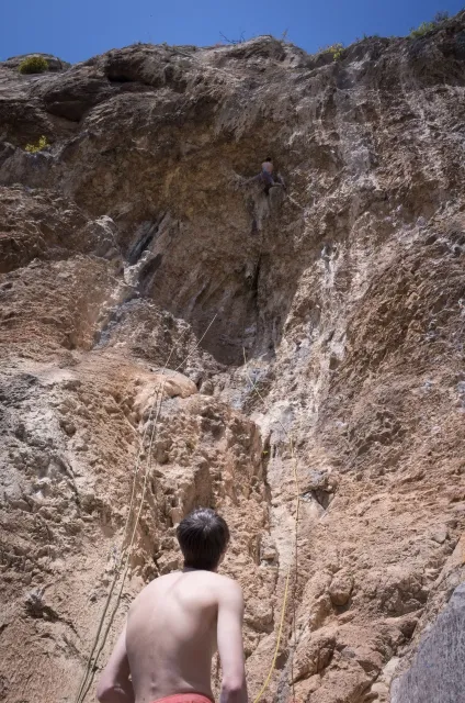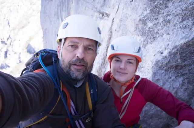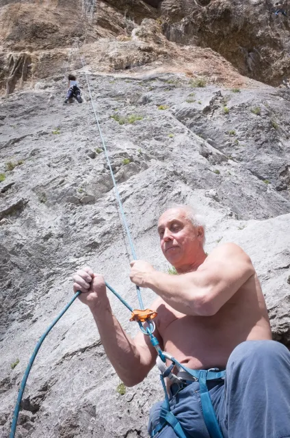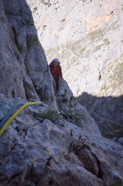 Jsme pod klíčovou trhlinou. Sedíme pod velkým převisem, z pod kterého je nejdříve nutné vylézt nějakých deset metrů šikmo do strany, teprve pak je vidět rovná, téměř kolmá škvíra. Od doby, co jsem ji lezl poprvé, se její obtížnost zvedla z 5c na 6a kvůli oklouzání vápence. Anička je mírně neklidná a zkouší i smlouvat, že bychom se prohodili. Kdepak, tohle si nemůže nechat ujít. Jsme tak ve dvou třetinách třísetmetrové stěny. Párkrát se silně nadechne a odlézá. Od chvíle, co se dotkne okraje trhliny už ji neuvidím. Ještě něco zamumlá a mizí mi z očí. Leze nekonečně dlouho, pohyb cítím vždy jen v tahu lana, a ten na dlouhé chvíle ustává. Vím, že má výdrž, ale co tam sakra tak dlouho dělá? Až když ji dolezu vysvětluje mi, že se v polovině délky vysoukala na sklaní odštěp, kde se posadila a vydýchávala. Na štandu není moc pohodlně, už nás bolí špičky, proto natahuji zbytek trhliny a máme před sebou poslední dvě délky, po nich nás již čeká slunko, které se do stěny dostává až odpoledne. Aňka na něho čeká i z jiného důvodu, snad se jí podaří vytlačit z tuby jakýsi sladký mišmaš, který ji ztuhl a ve stěně jej nedokáže vypudit do pusy. Nahoře je jiný svět. Vedro a suchopár, kam oko dohlédne. Těším se na oběd, co Anička připravila. Vytáhla jakýsi doutník v igelitu a mně se začaly sbíhat sliny. Vypadá jako tenčí párek. Zjišťuji, že z vepříka v něm není ani štětina. Je to sójový buřt nebo tak něco!!! Hlad je ale veliký, tak by chutnal i chobot z rosomáka.
