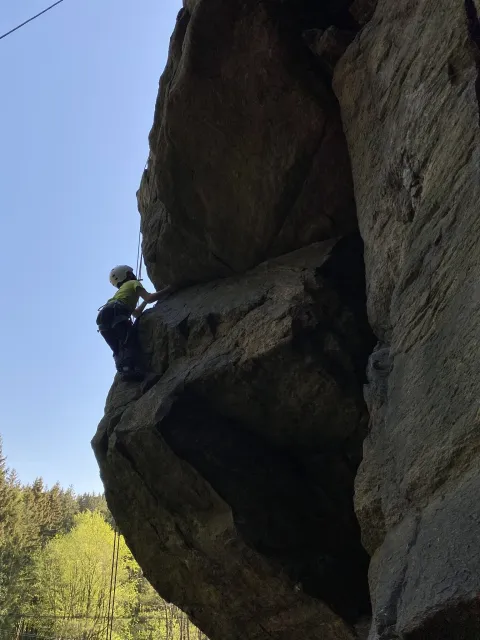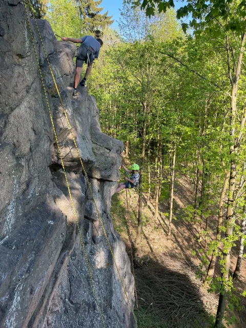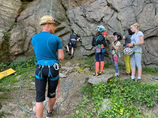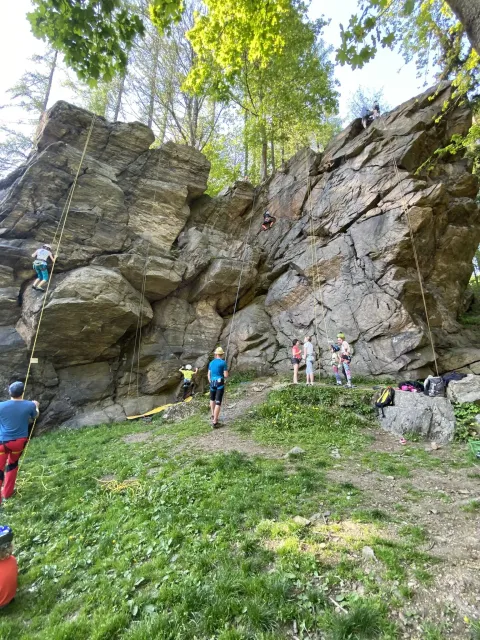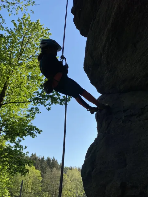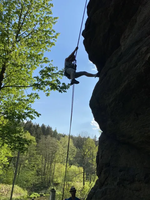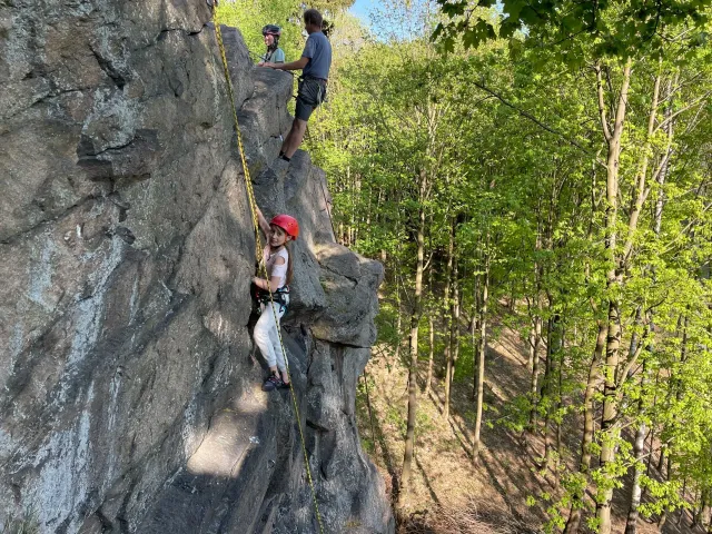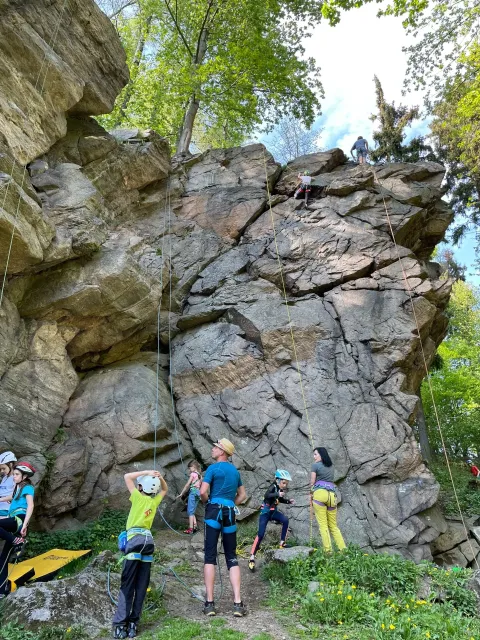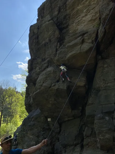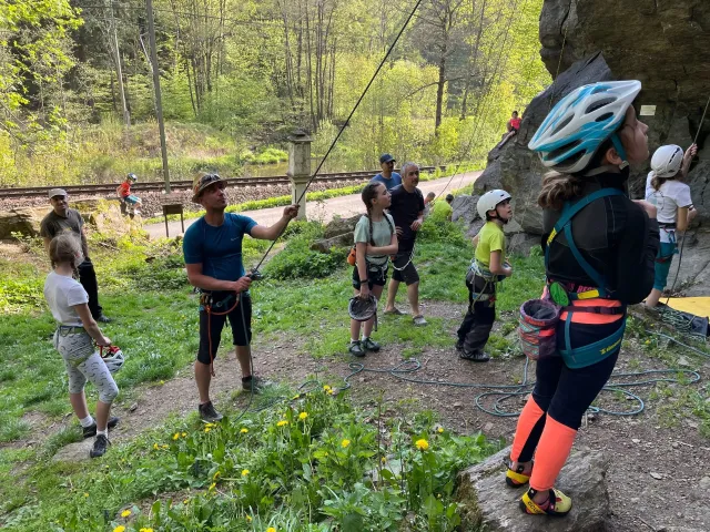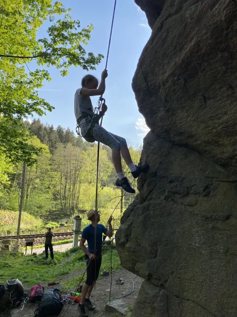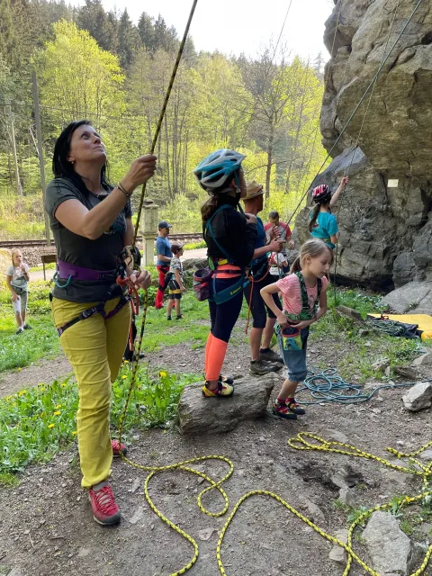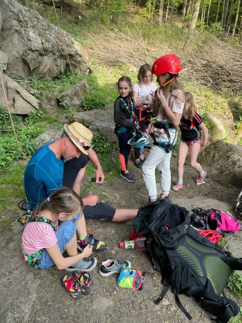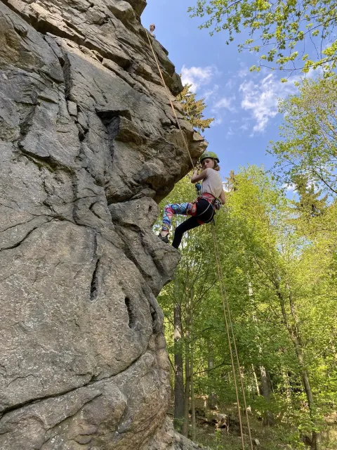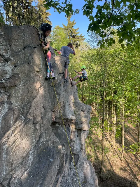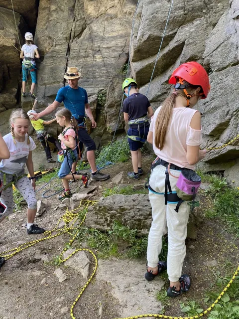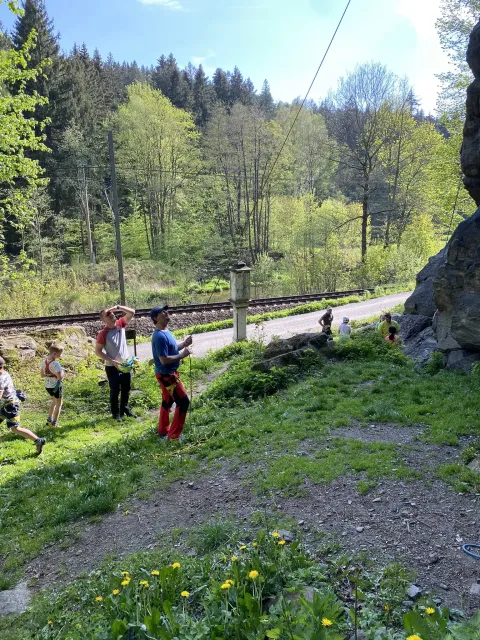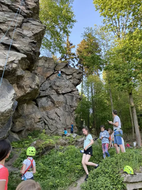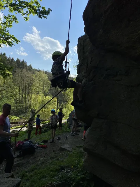 Skalní lezení si vyzkoušelo 17 dětí (z prvního a druhého kroužku), někteří úplně poprvé. Děti si mohly vyzkoušet i slanění, které jsme zatím nacvičovali jen na žebřinách nebo umělé stěně. Někdo se trochu zalekl výšky a slanění odložil na příště. Jednoznačně nejvíc se to zalíbilo Tomovi Č., který využil možnosti vyběhnout na skálu a pohodlně sjet dolů hned několikrát.