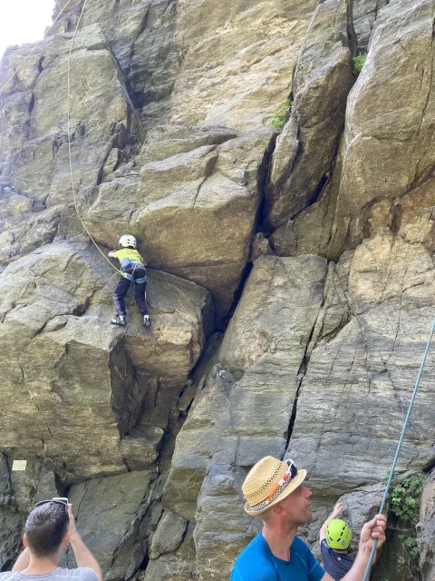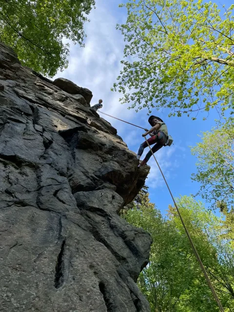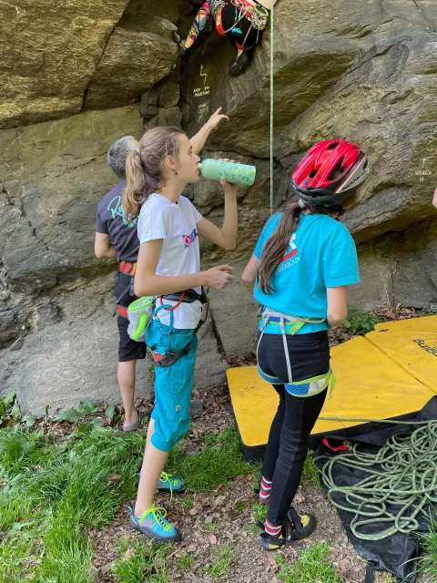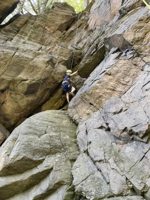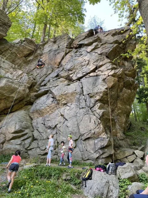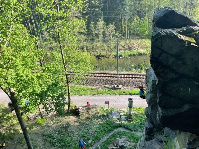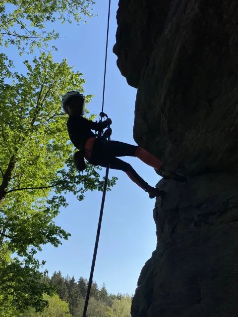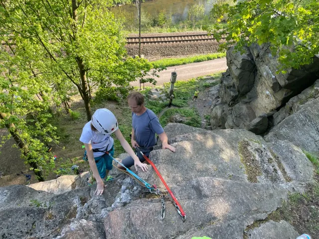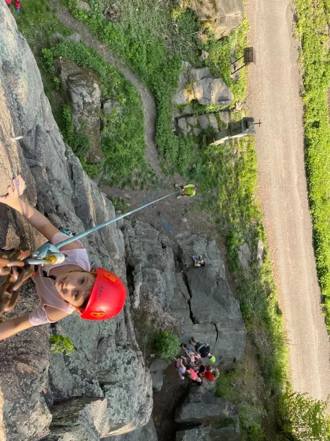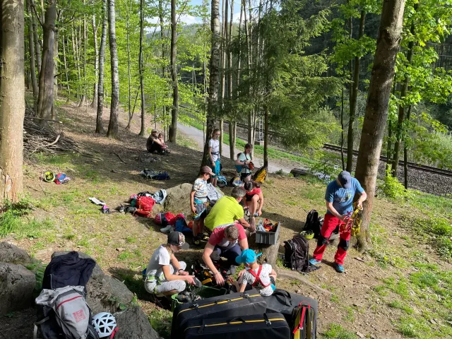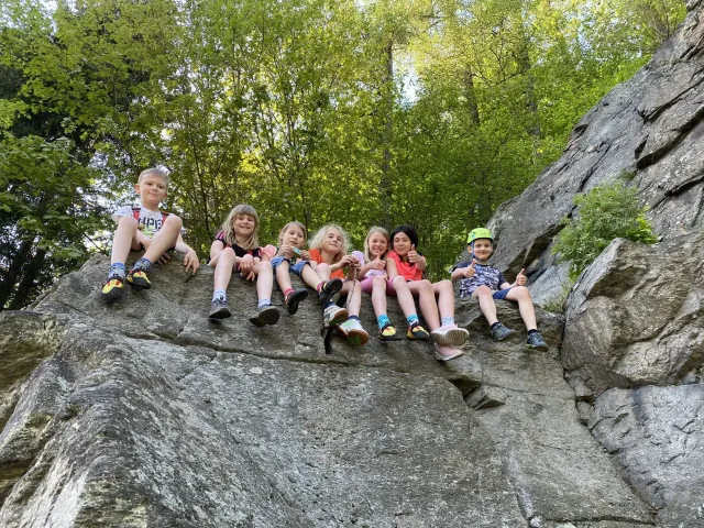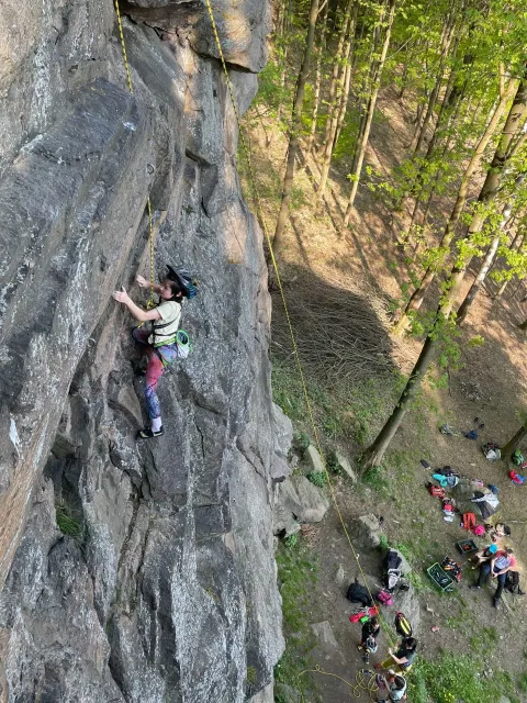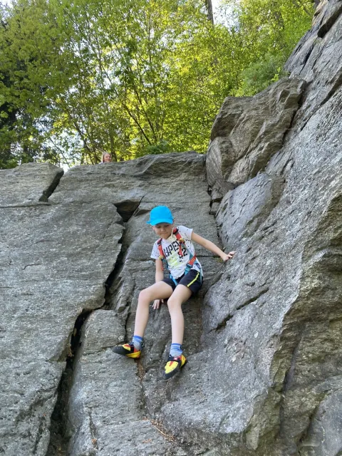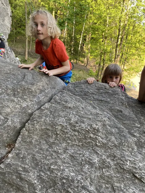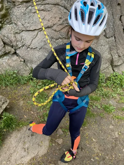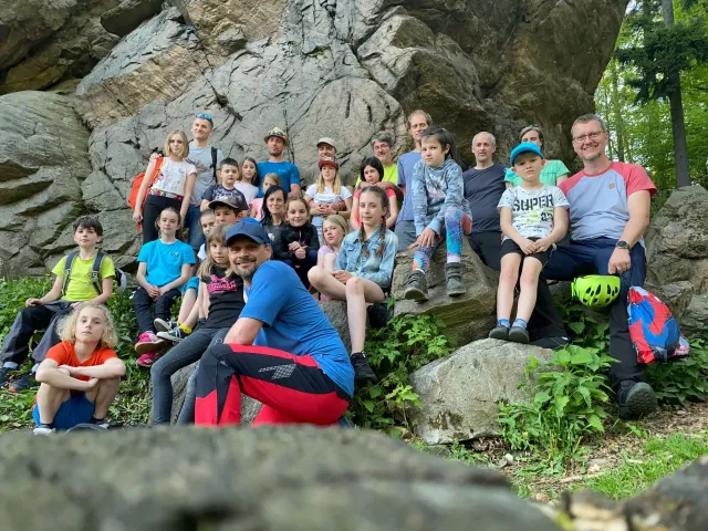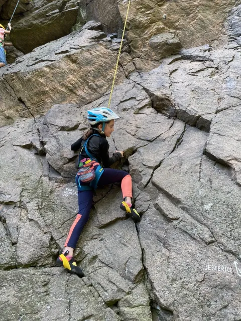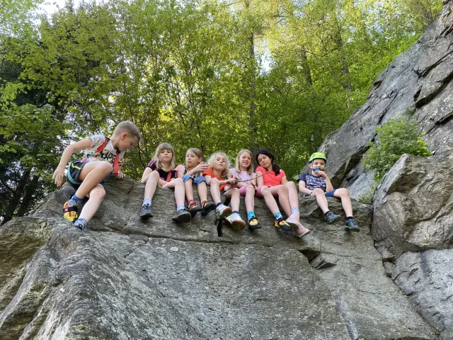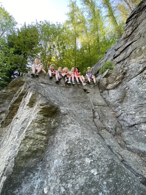 Skalní lezení si vyzkoušelo 17 dětí (z prvního a druhého kroužku), někteří úplně poprvé. Děti si mohly vyzkoušet i slanění, které jsme zatím nacvičovali jen na žebřinách nebo umělé stěně. Někdo se trochu zalekl výšky a slanění odložil na příště. Jednoznačně nejvíc se to zalíbilo Tomovi Č., který využil možnosti vyběhnout na skálu a pohodlně sjet dolů hned několikrát.