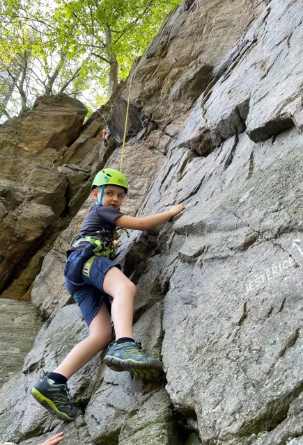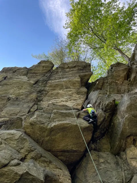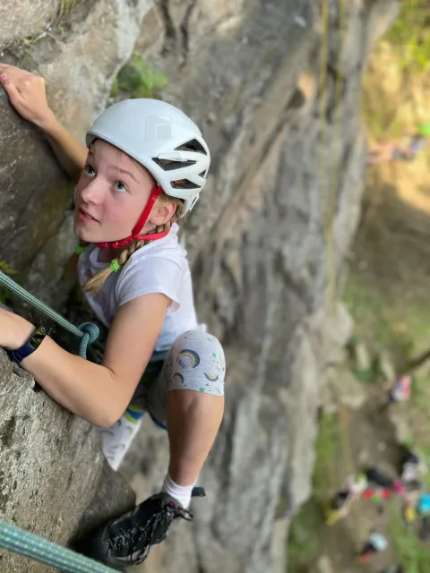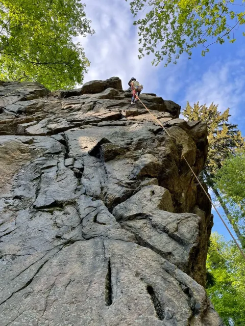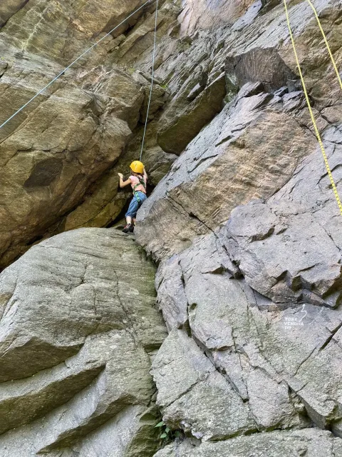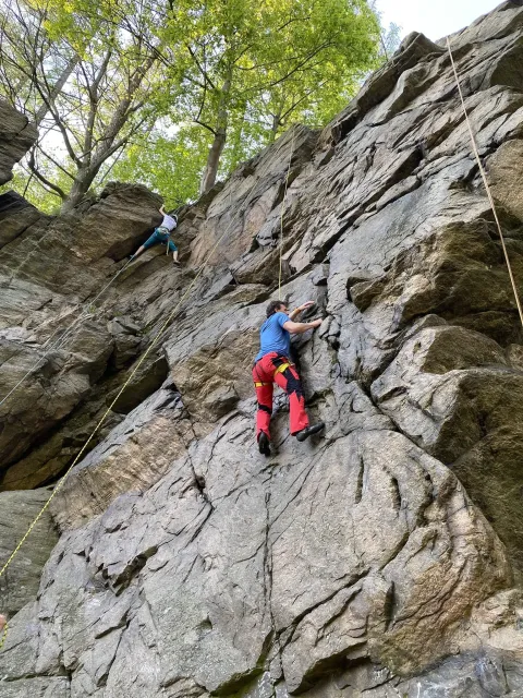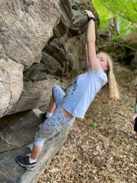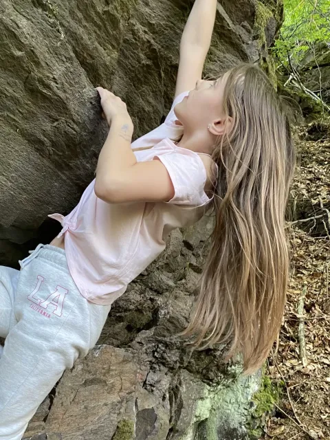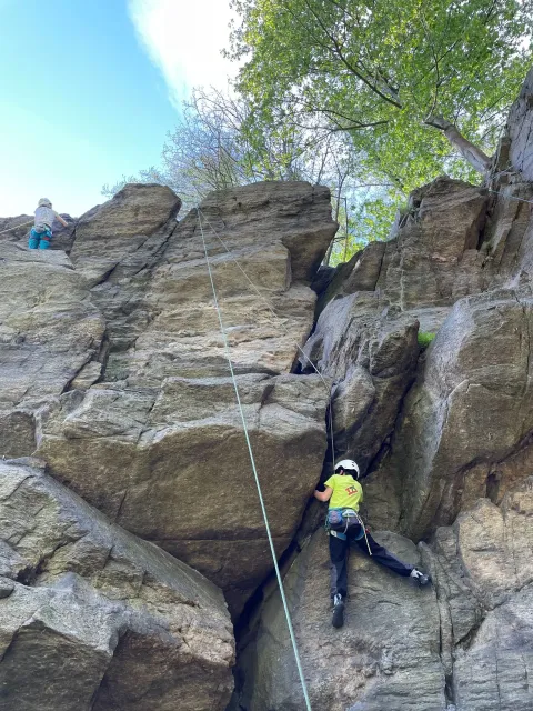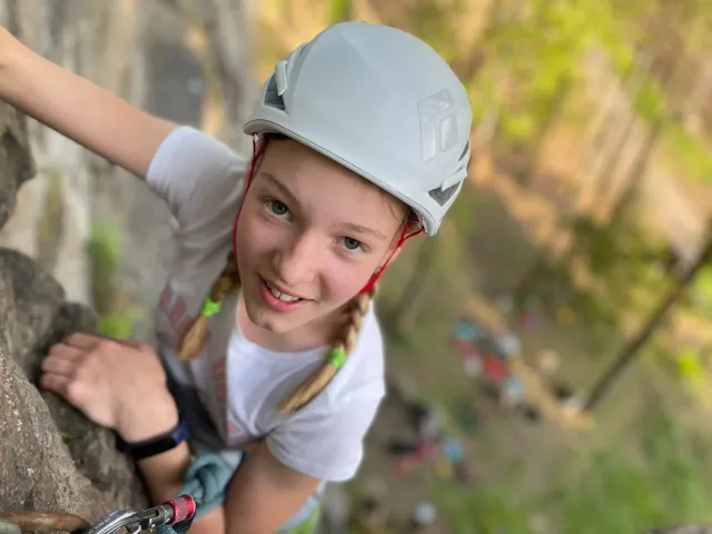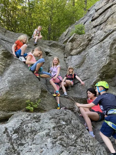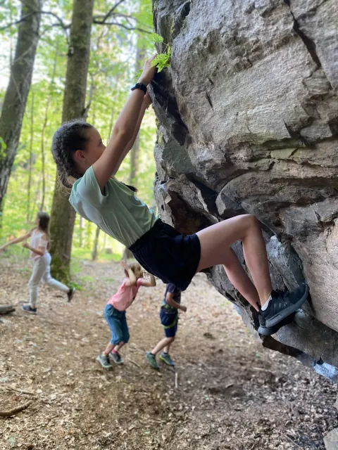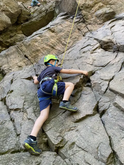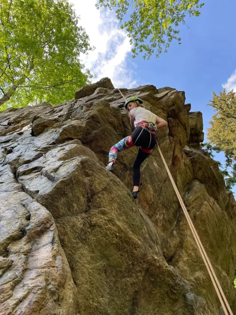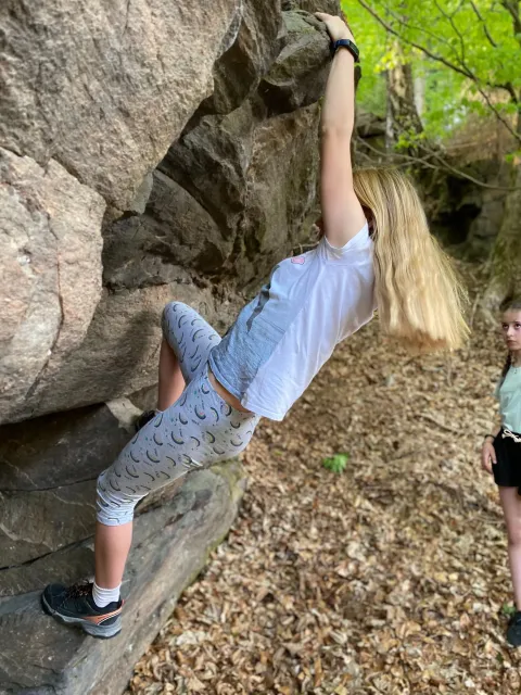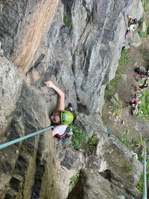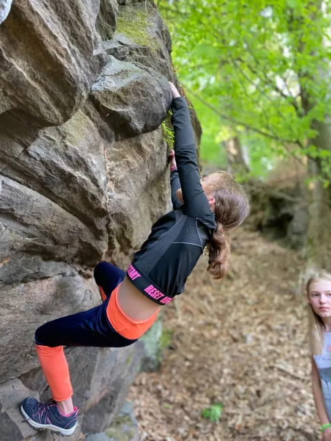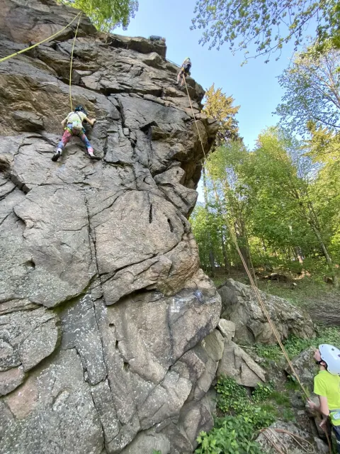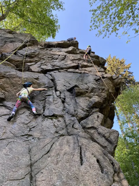 Skalní lezení si vyzkoušelo 17 dětí (z prvního a druhého kroužku), někteří úplně poprvé. Děti si mohly vyzkoušet i slanění, které jsme zatím nacvičovali jen na žebřinách nebo umělé stěně. Někdo se trochu zalekl výšky a slanění odložil na příště. Jednoznačně nejvíc se to zalíbilo Tomovi Č., který využil možnosti vyběhnout na skálu a pohodlně sjet dolů hned několikrát.