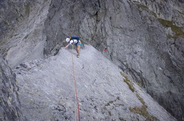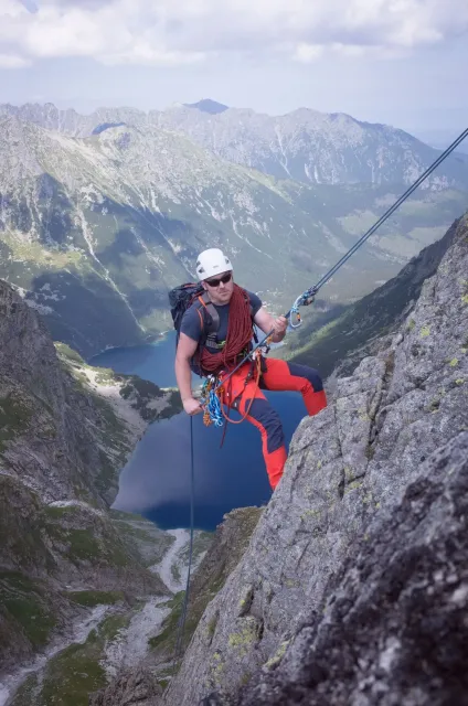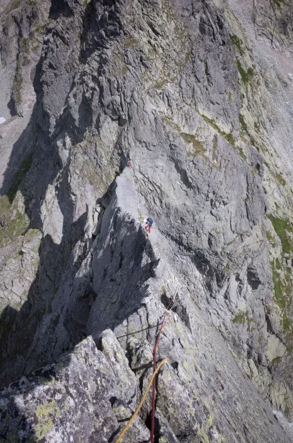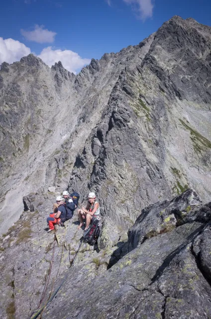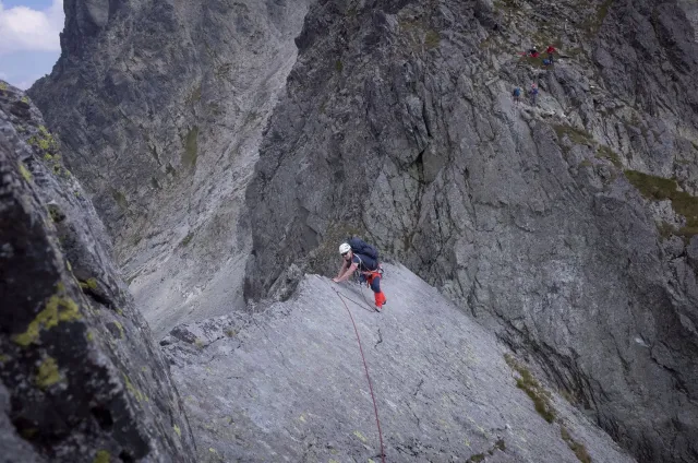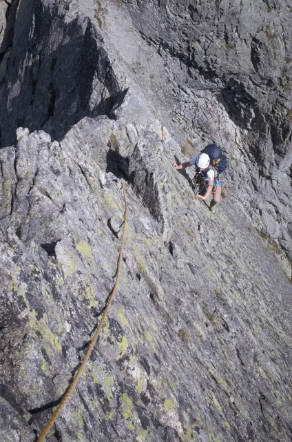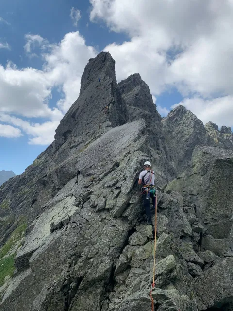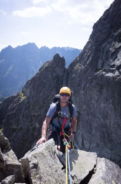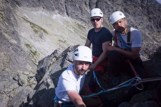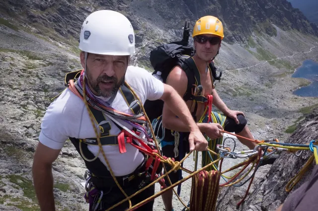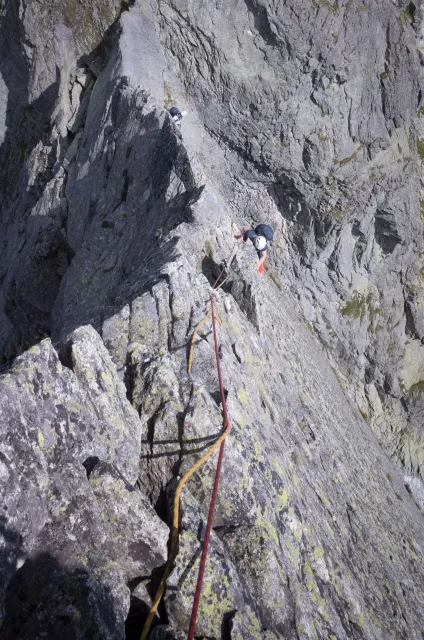 Kompromisní budíček v šest všichni akceptují. Ranní kávička z batohových kávovarů, zaparkování ve Štrbském a úprk pod blankytnou oblohou na Popradské. Tam se zařazujeme do převážně polsky mluvícího špalíru směřujícího na Rysy a vystupujeme z něho nad Žabímy plesy. V trávě a sutinách se sice dál již hrabeme sami, ale na Žabím Koni, našem cíli, je již živo. „Spodem chodí jen kokosy“, degraduje nás na tropické ořechy Hanka a vede nás jinou stezkou k nástupu. Se Zipem jdou do cesty jako první, budou určitě rychlejší, zatímco Adam, Honza a já budeme postupovat ve třech. V první délce jsme si s klukama doladili komunikaci a povely a traverzem jsme přešli nad slanění do Žabího sedla. Tady je první zášprc. Polská trojka právě slaňuje a v první délce na Koni jsou dvě další dvojice. Hanka neotálí, sundává výstroj a háže opalovačku. My se kocháme střídavě výhledem do doliny a na ni.