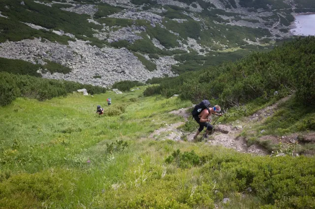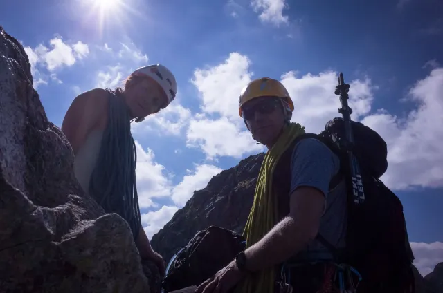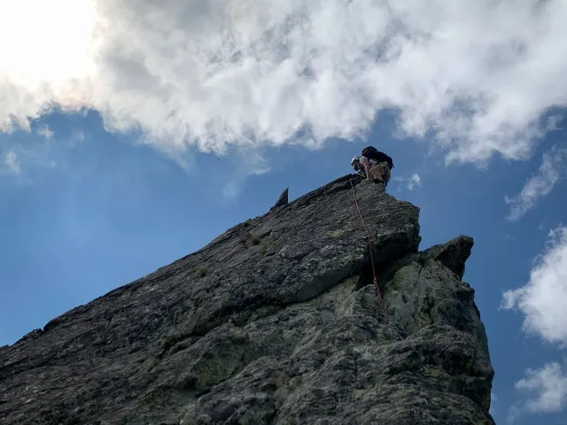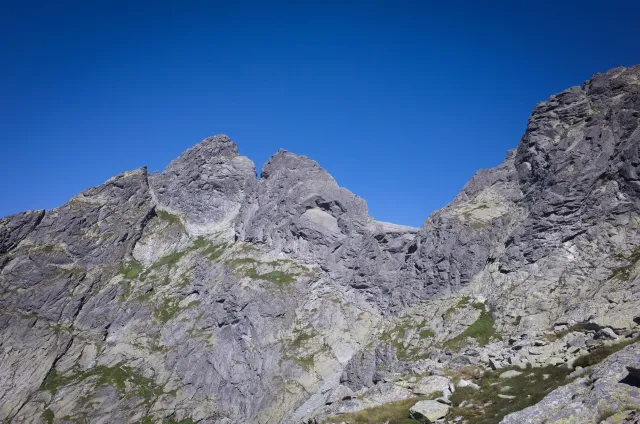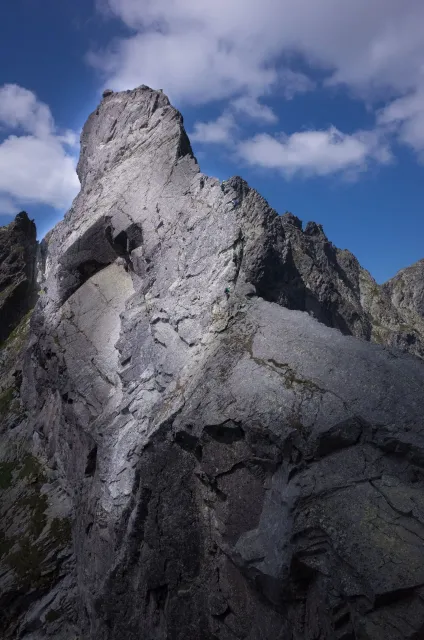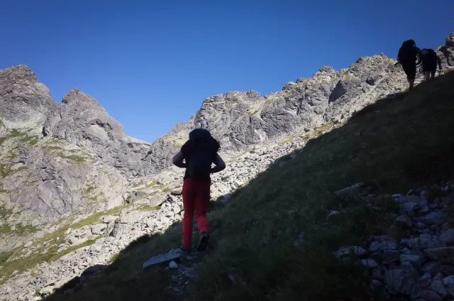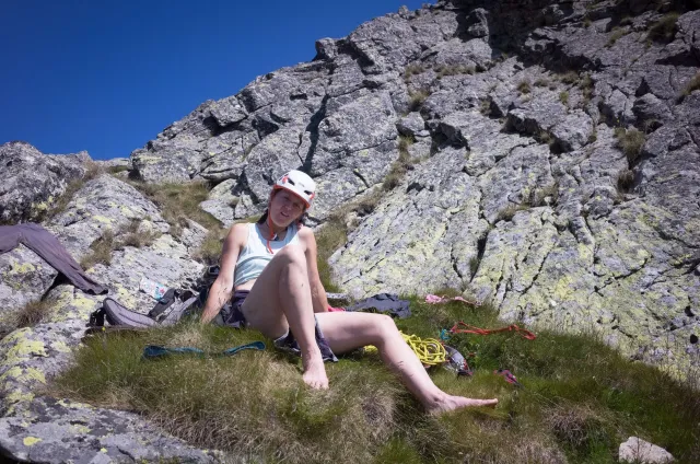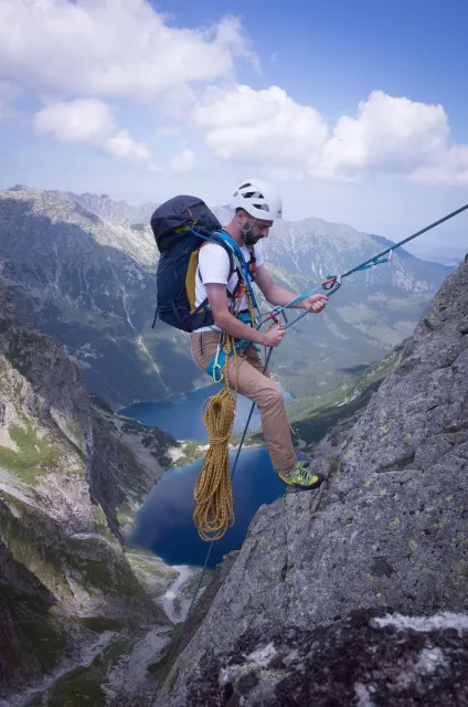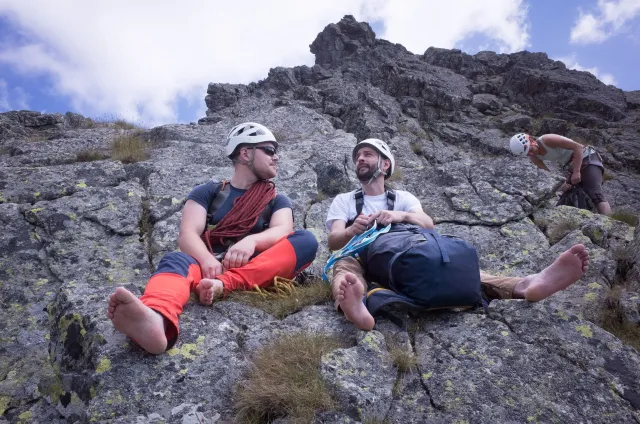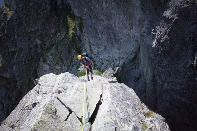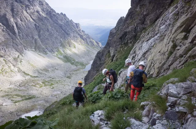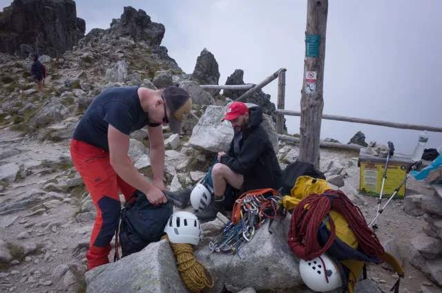 Kompromisní budíček v šest všichni akceptují. Ranní kávička z batohových kávovarů, zaparkování ve Štrbském a úprk pod blankytnou oblohou na Popradské. Tam se zařazujeme do převážně polsky mluvícího špalíru směřujícího na Rysy a vystupujeme z něho nad Žabímy plesy. V trávě a sutinách se sice dál již hrabeme sami, ale na Žabím Koni, našem cíli, je již živo. „Spodem chodí jen kokosy“, degraduje nás na tropické ořechy Hanka a vede nás jinou stezkou k nástupu. Se Zipem jdou do cesty jako první, budou určitě rychlejší, zatímco Adam, Honza a já budeme postupovat ve třech. V první délce jsme si s klukama doladili komunikaci a povely a traverzem jsme přešli nad slanění do Žabího sedla. Tady je první zášprc. Polská trojka právě slaňuje a v první délce na Koni jsou dvě další dvojice. Hanka neotálí, sundává výstroj a háže opalovačku. My se kocháme střídavě výhledem do doliny a na ni.