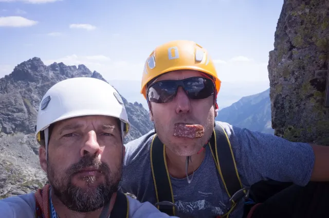 Konečně můžeme taky sjet dolů a nastoupit do vodorovné střechy východního hřebene Žabího Koně. Erárního matroše, který nelze vyprostit, ve skále za léta přibývá a vlastního téměř netřeba zakládat. To, co založím je tedy z části pro kluky, aby si taky osahali jak a co. První délka, která dělá Koně koněm je za námi, a řešíme druhou. Ta začíná téměř kolmým odlezem za hranu, zpoza které se v mírném záklonu zase vracíme zpět. Nádhera. Myslím, že druhá a třetí délka by se dali spojit do jedné, natolik si tu cestu ale nepamatujeme a štandujeme vždy, když je kde. Čtvrtou délku bychom rádi zakončili na vrcholu, sedíme však dobře půldruhé hodiny kousek od něho, než se Polákům před námi podaří slanit a uvolnit nám tím místo. Všechny ty čekačky způsobují, že musíme upustit od původního plánu vylézt si po slanění ještě Haberleina jižní stěnou, doslaňováváme totiž někdy před čtvrtou. Slanění je ohavné a jen díky tomu, že si jeho ohavnost z minula nepamatuji, nasedám do lan natěšen na sjezd na šedesátkových dvojčatech. Sice nám to umožňuje dostat se dolu na jeden zátah, ale ten zátah mění několikrát směr, jednu chvíli slaňujeme dokonce do kopce. Další sestup odhadujeme a dovádí nás do komína, do kterého si opět raději hážeme jeden pramen na slanění. Pokud tam ještě někdy půjdeme a budeme si číst tyto řádky, tak sem záměrně píši, že nad komínem se dá jít ještě dál vlevo a sejít to po svých. Narážíme na sněhové pole a to se dá využít jedině ke koulovačce. Inu dětmi můžeme být v každém věku. Dnes už je kemp ve Staré Lesné jistý, je však plný a místo nacházíme jen tak tak. Dehydrovaná (a taky částečně spálená) těla zavodňujeme v kempovém bufetu Štajgrem, na jehož chuť si někteří přivykají okamžitě, někteří k tomu potřebují celý víkend. Ještě plánujeme zítřek, který rozlouskáváme s podporou přítele na telefonu (Fouse). Odpoledne totiž hrozí déšť a hledáme něco tak do patnácté hodiny.