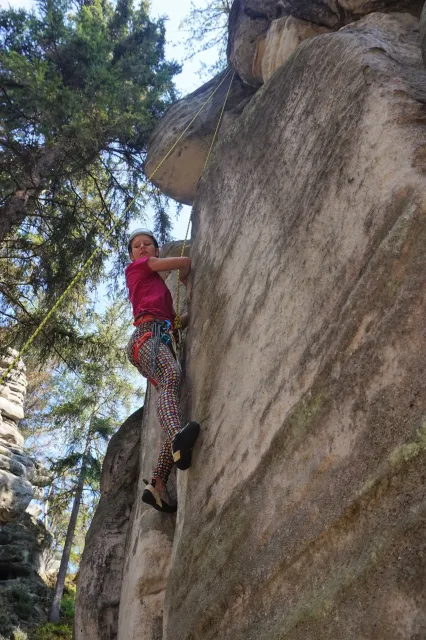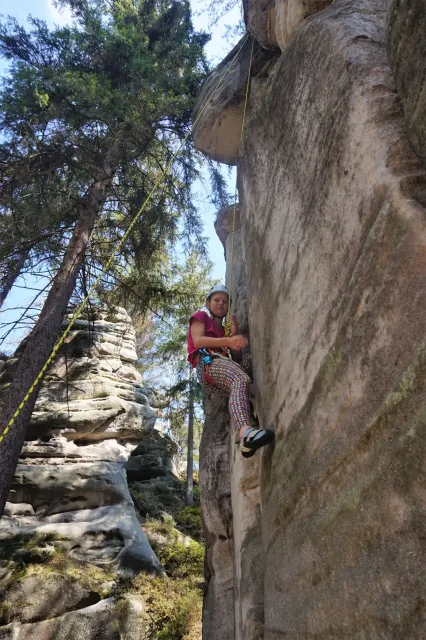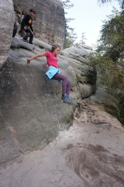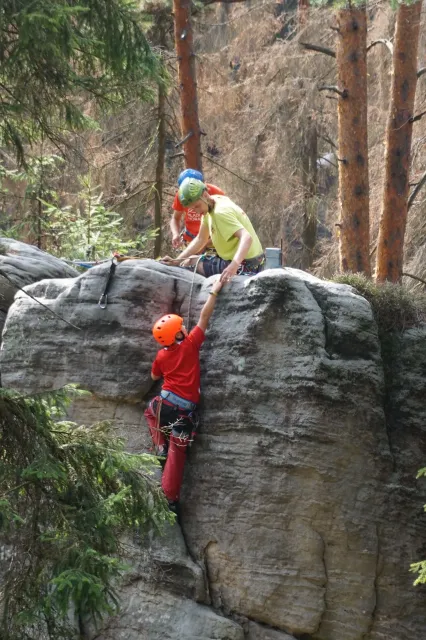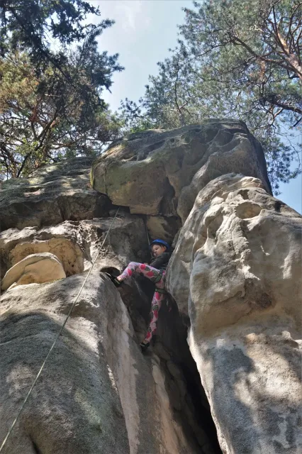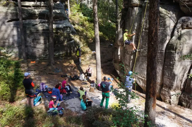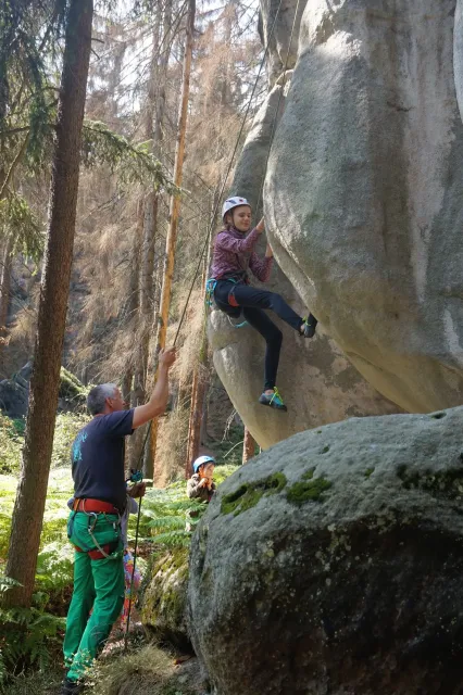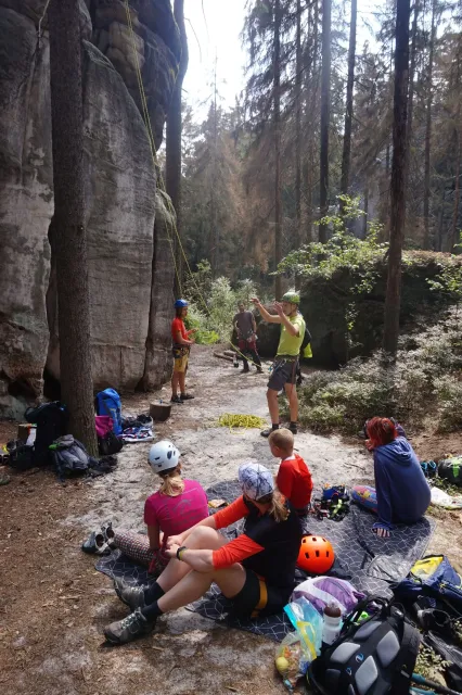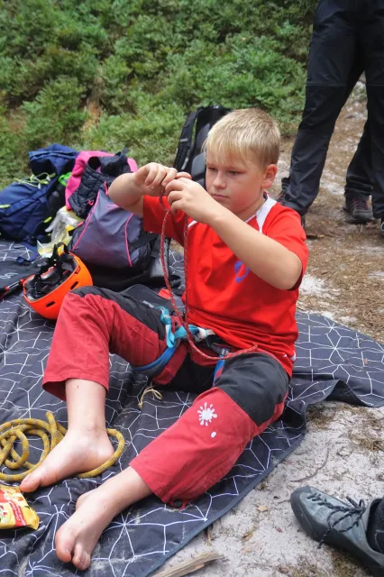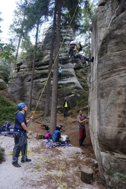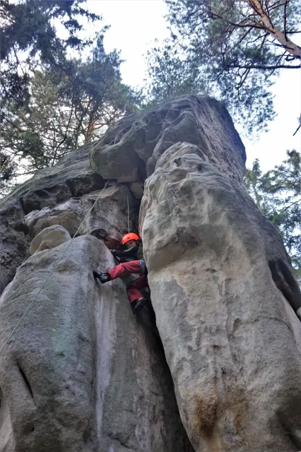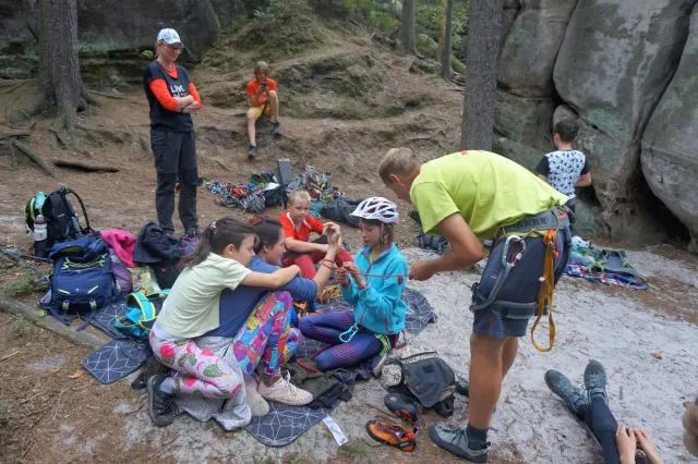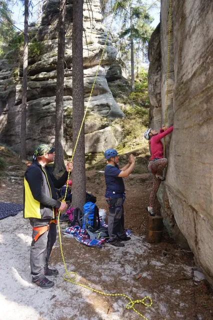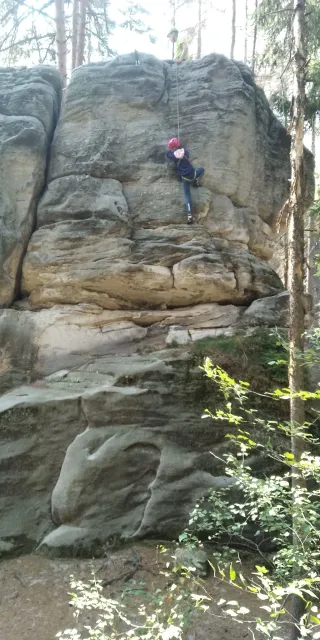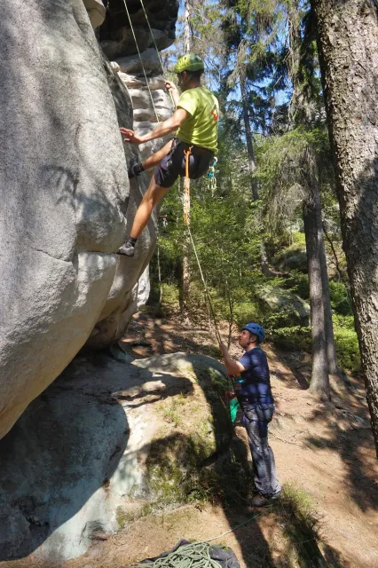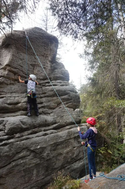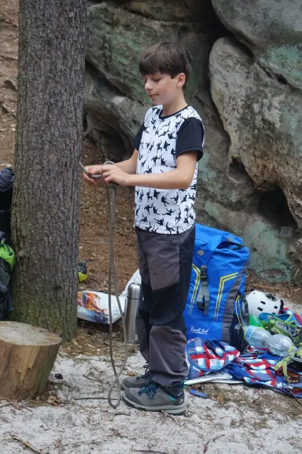 První nadhozený termín na výpravu s mladými horaly na pískovcové lezení propršel, a tak je tu pokus druhý …. a opět je předpověď počasí pestrá. Lanškroun je po ránu omytý malou přeháňkou, ale dle meteorologických map nad Ostaší žádný mrak nevisí, takže vyrážíme směr skály. A je z toho nakonec nádherný slunečný den. Jako vhodný terén pro začátečnické lezení na písku volí Charli, Petr a Dušan skály přímo pod Kočičím hradem. Mladí i starší horalové si osahávají pískovcové skály a vcelku úspěšně se perou se spárami, komíny a povrchem skal drsnějším než jsou zvyklí z běžného lezení v našem okolí. Trénují lezení, slaňování a v závěru vyjde čas i na nějaké to uzlování a prolézání okolních skal. Tak snad všechny tyto zkušenosti při závodech na Kokořínsku všichni hezky využijí. Minimálně to byl moc fajn den.