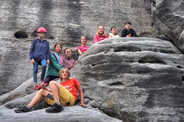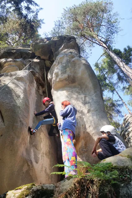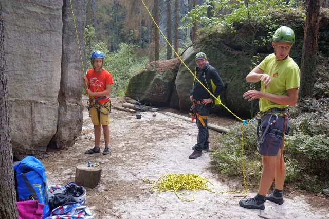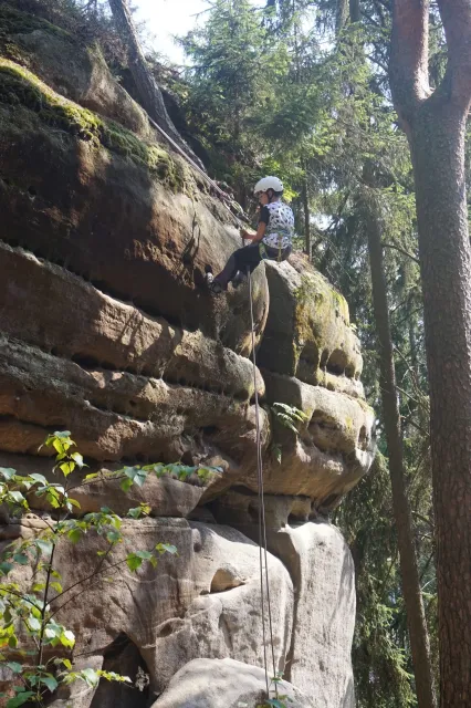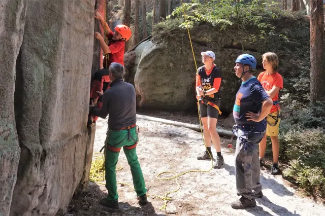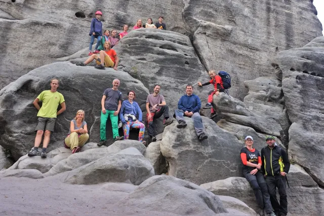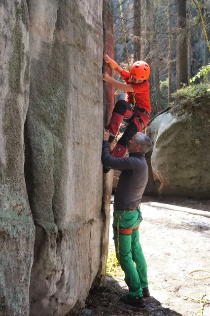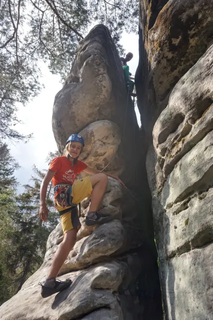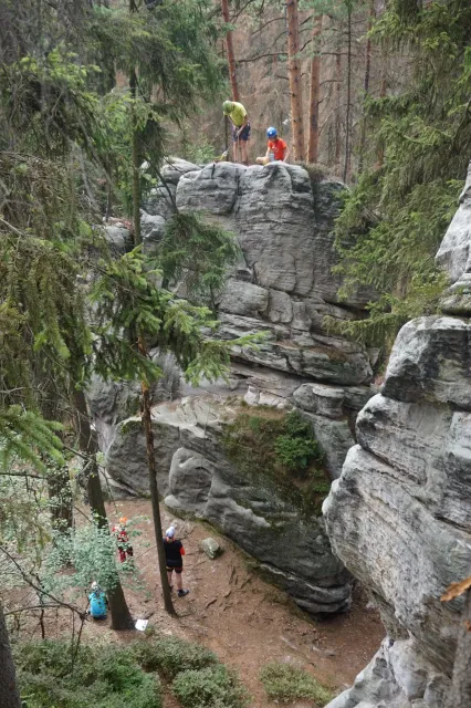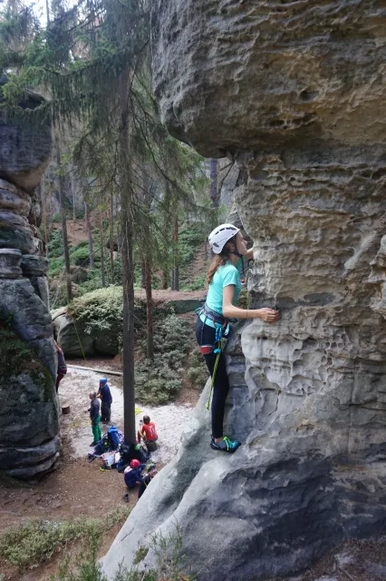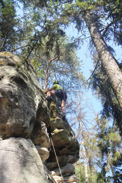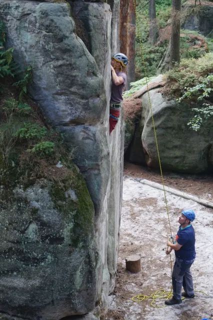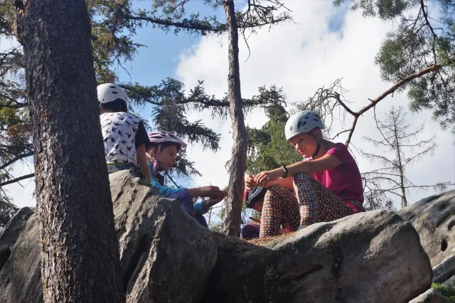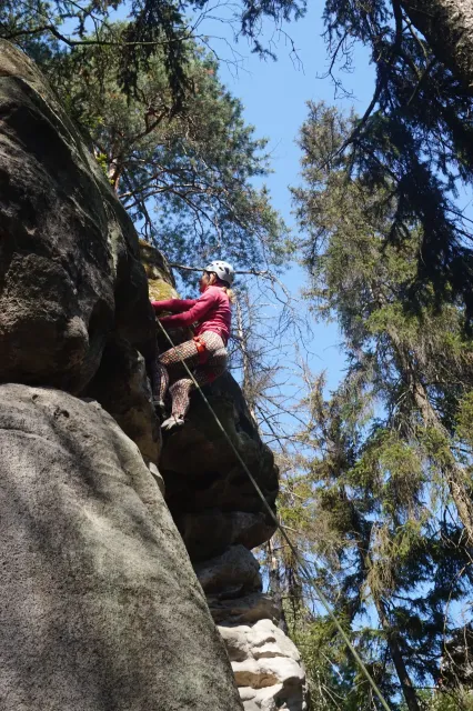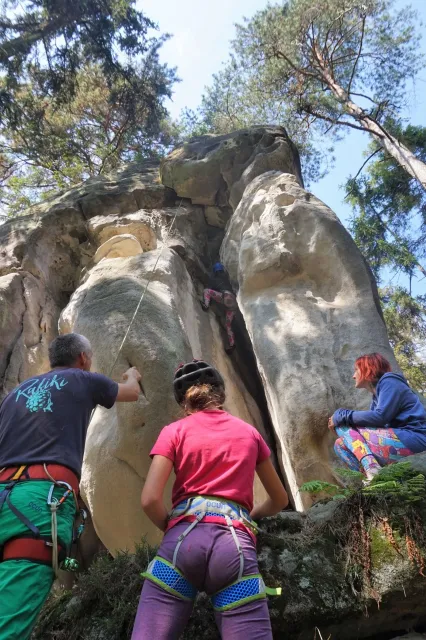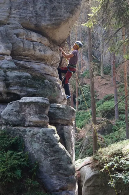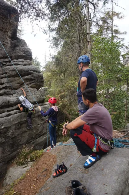 První nadhozený termín na výpravu s mladými horaly na pískovcové lezení propršel, a tak je tu pokus druhý …. a opět je předpověď počasí pestrá. Lanškroun je po ránu omytý malou přeháňkou, ale dle meteorologických map nad Ostaší žádný mrak nevisí, takže vyrážíme směr skály. A je z toho nakonec nádherný slunečný den. Jako vhodný terén pro začátečnické lezení na písku volí Charli, Petr a Dušan skály přímo pod Kočičím hradem. Mladí i starší horalové si osahávají pískovcové skály a vcelku úspěšně se perou se spárami, komíny a povrchem skal drsnějším než jsou zvyklí z běžného lezení v našem okolí. Trénují lezení, slaňování a v závěru vyjde čas i na nějaké to uzlování a prolézání okolních skal. Tak snad všechny tyto zkušenosti při závodech na Kokořínsku všichni hezky využijí. Minimálně to byl moc fajn den.