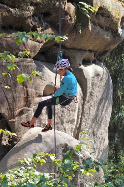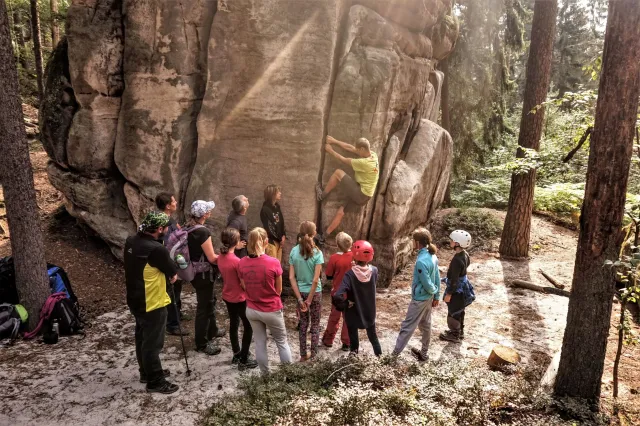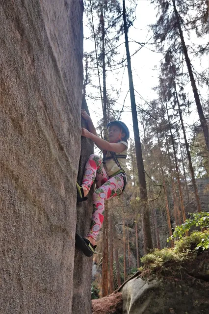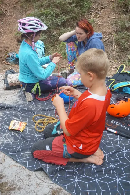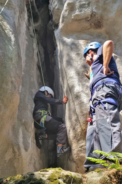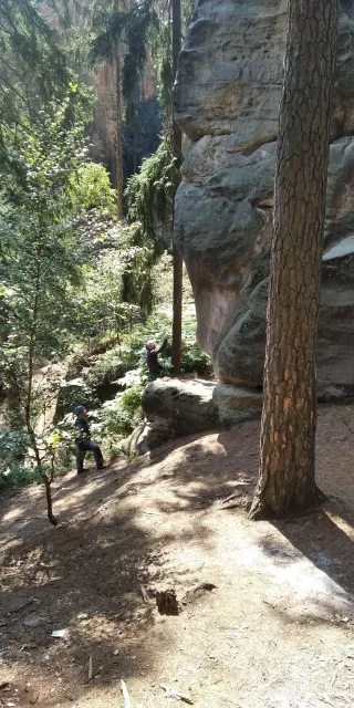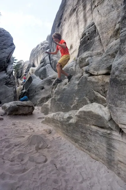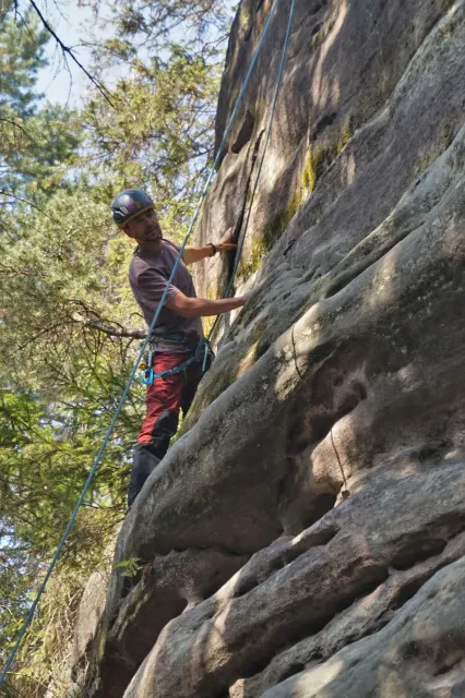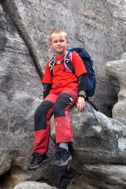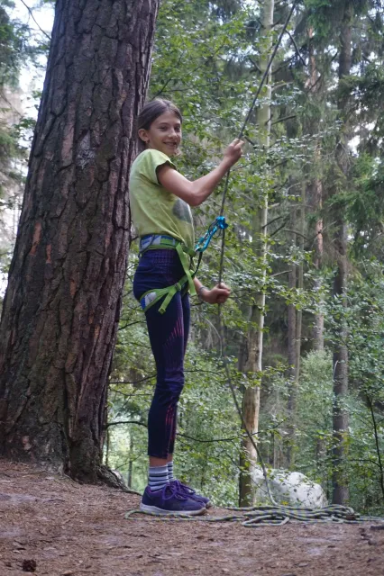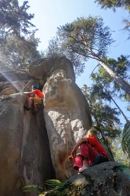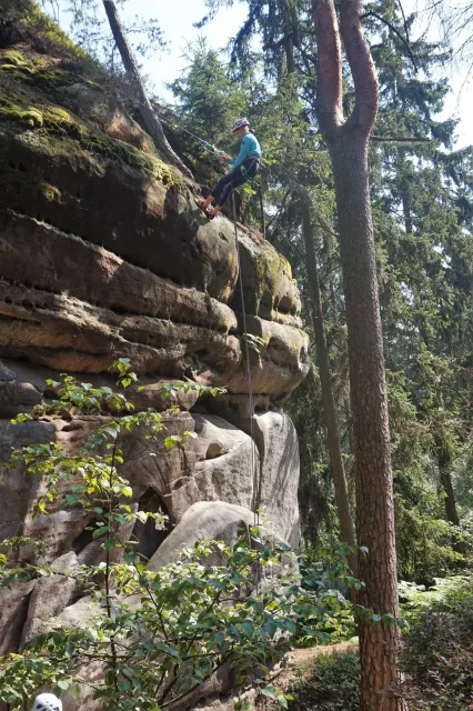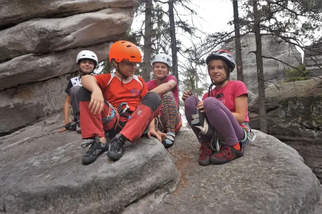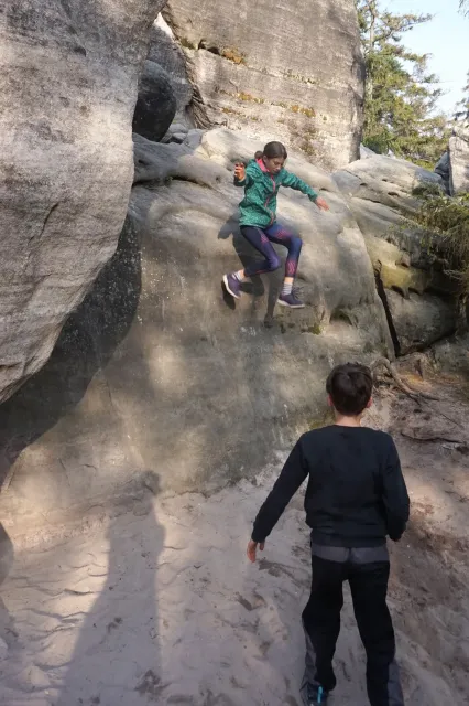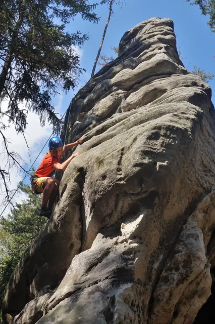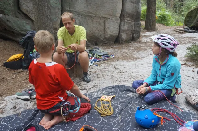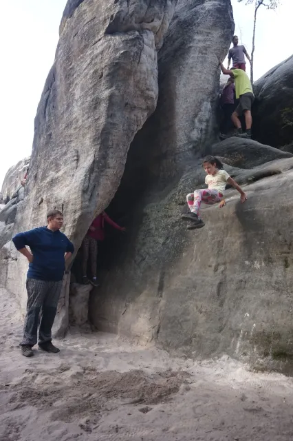 První nadhozený termín na výpravu s mladými horaly na pískovcové lezení propršel, a tak je tu pokus druhý …. a opět je předpověď počasí pestrá. Lanškroun je po ránu omytý malou přeháňkou, ale dle meteorologických map nad Ostaší žádný mrak nevisí, takže vyrážíme směr skály. A je z toho nakonec nádherný slunečný den. Jako vhodný terén pro začátečnické lezení na písku volí Charli, Petr a Dušan skály přímo pod Kočičím hradem. Mladí i starší horalové si osahávají pískovcové skály a vcelku úspěšně se perou se spárami, komíny a povrchem skal drsnějším než jsou zvyklí z běžného lezení v našem okolí. Trénují lezení, slaňování a v závěru vyjde čas i na nějaké to uzlování a prolézání okolních skal. Tak snad všechny tyto zkušenosti při závodech na Kokořínsku všichni hezky využijí. Minimálně to byl moc fajn den.