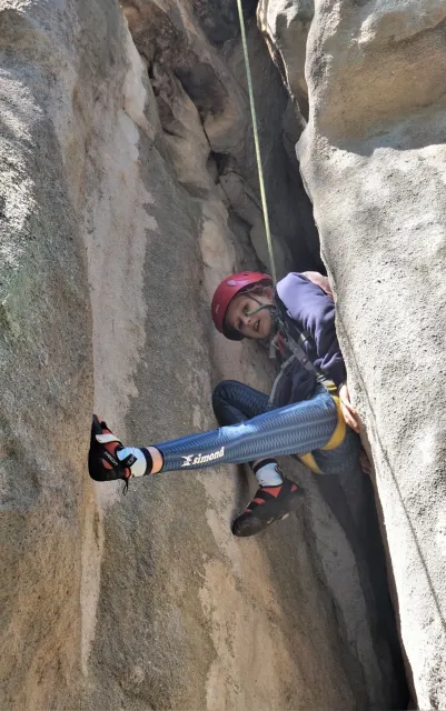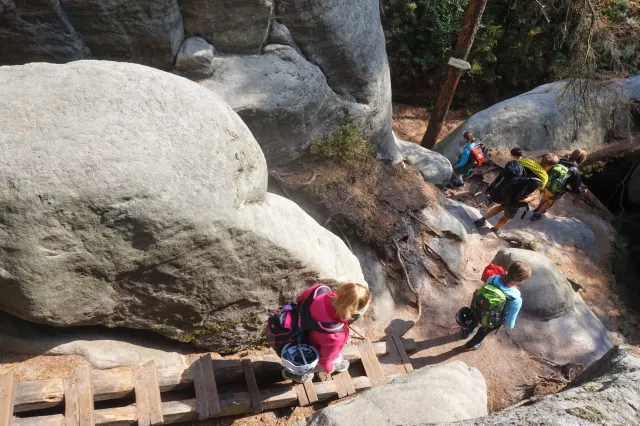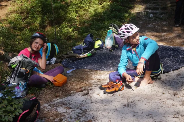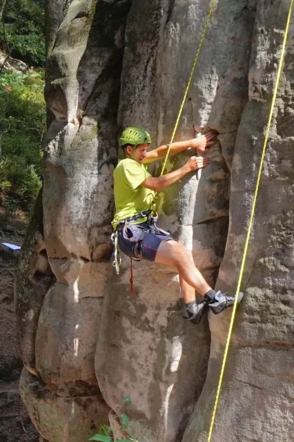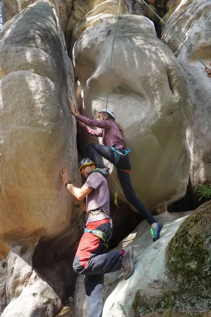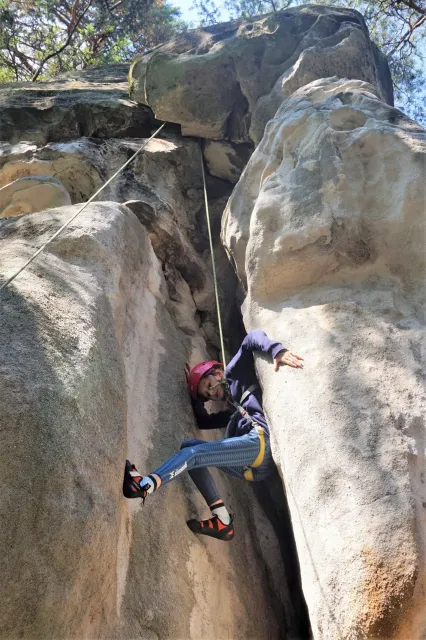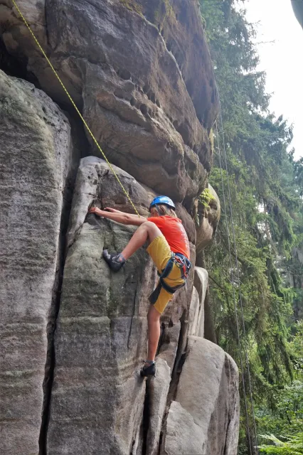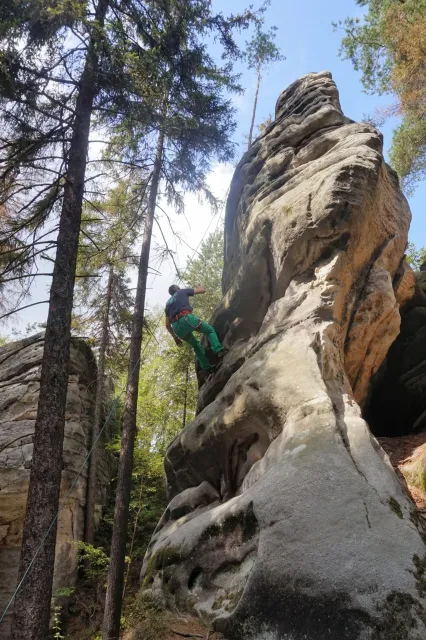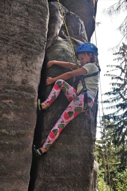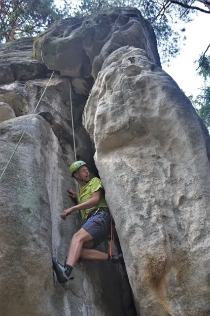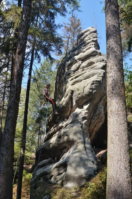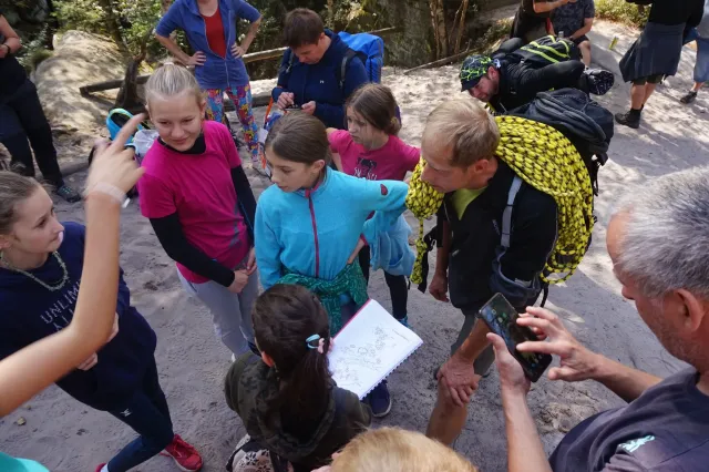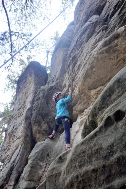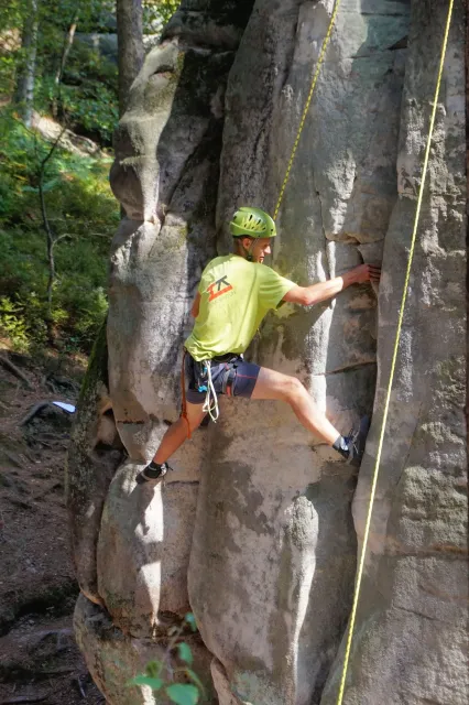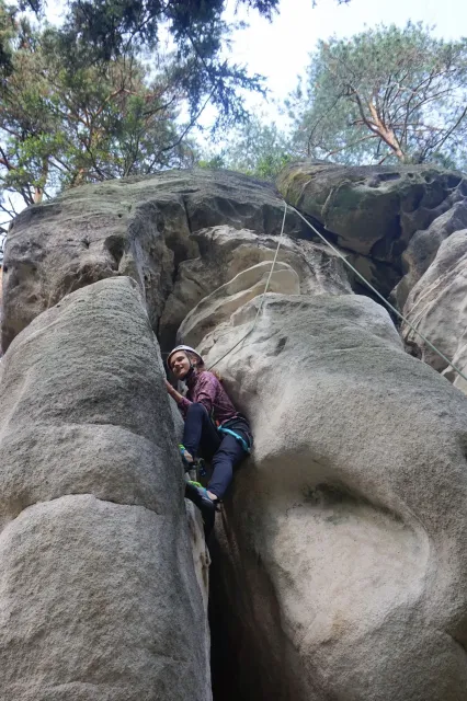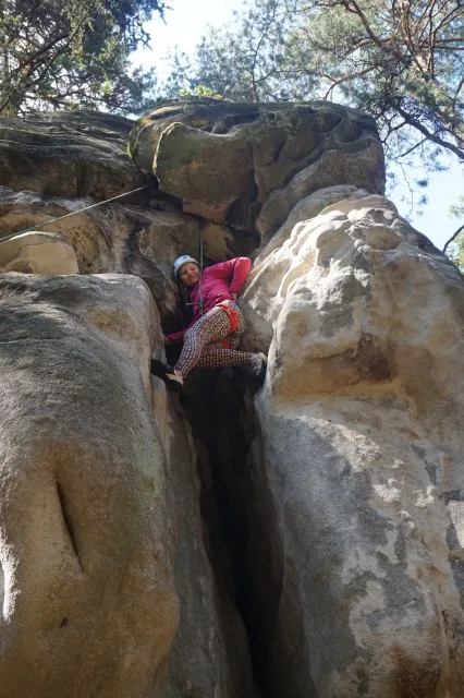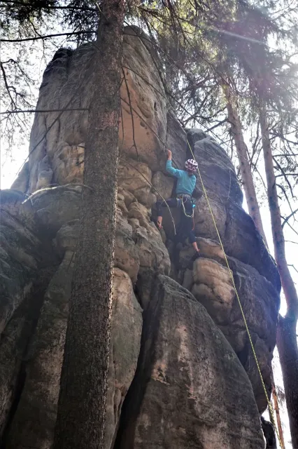 První nadhozený termín na výpravu s mladými horaly na pískovcové lezení propršel, a tak je tu pokus druhý …. a opět je předpověď počasí pestrá. Lanškroun je po ránu omytý malou přeháňkou, ale dle meteorologických map nad Ostaší žádný mrak nevisí, takže vyrážíme směr skály. A je z toho nakonec nádherný slunečný den. Jako vhodný terén pro začátečnické lezení na písku volí Charli, Petr a Dušan skály přímo pod Kočičím hradem. Mladí i starší horalové si osahávají pískovcové skály a vcelku úspěšně se perou se spárami, komíny a povrchem skal drsnějším než jsou zvyklí z běžného lezení v našem okolí. Trénují lezení, slaňování a v závěru vyjde čas i na nějaké to uzlování a prolézání okolních skal. Tak snad všechny tyto zkušenosti při závodech na Kokořínsku všichni hezky využijí. Minimálně to byl moc fajn den.
